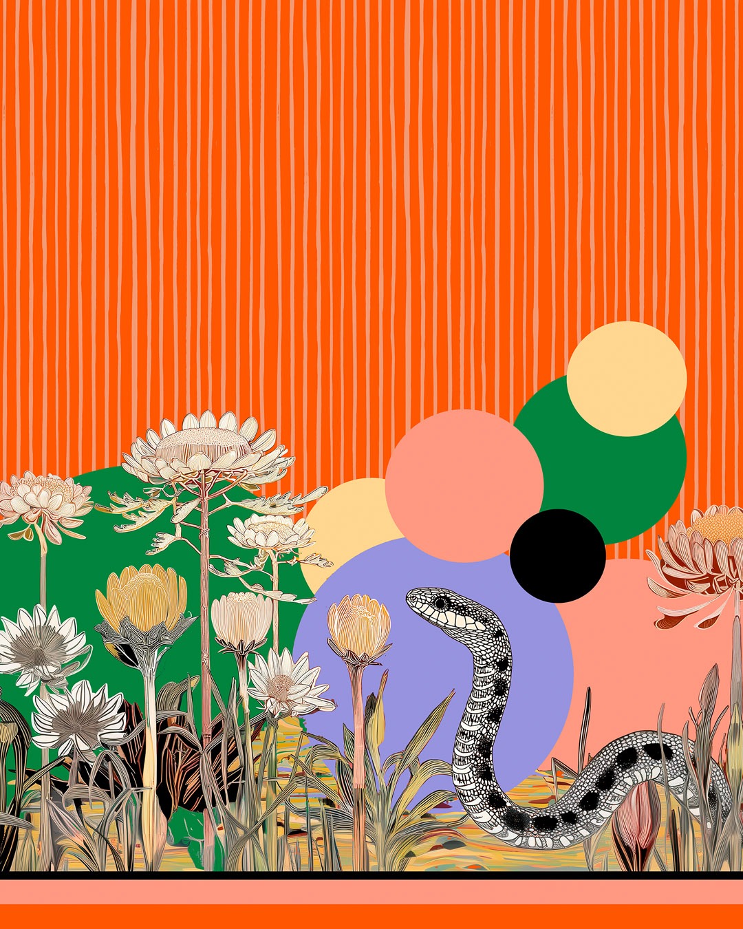 El diseño presenta un estampado de nuestra colección Paraíso, protagonizado por un mono ilustrado en tonos rosa y negro, combinado con bloques de color vibrantes y elementos botánicos que elevan la prenda a un look artístico y contemporáneo.