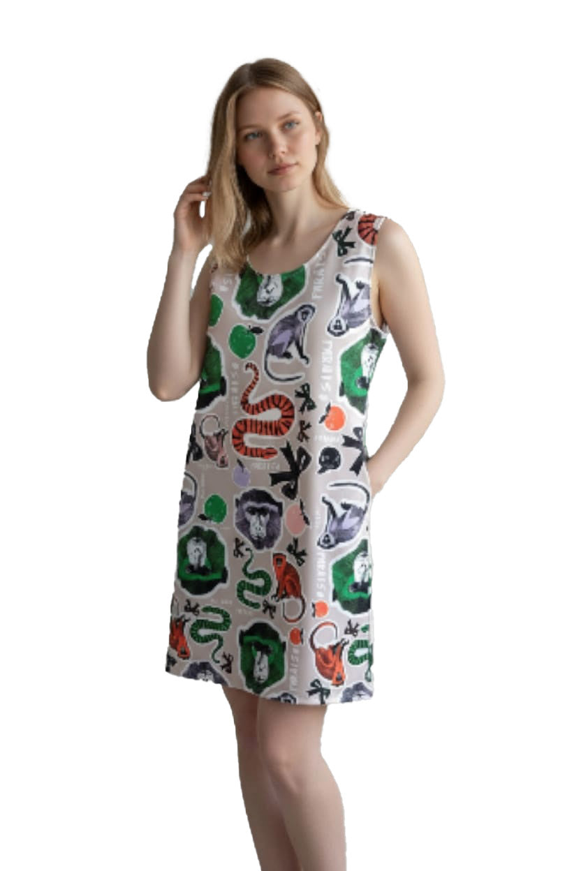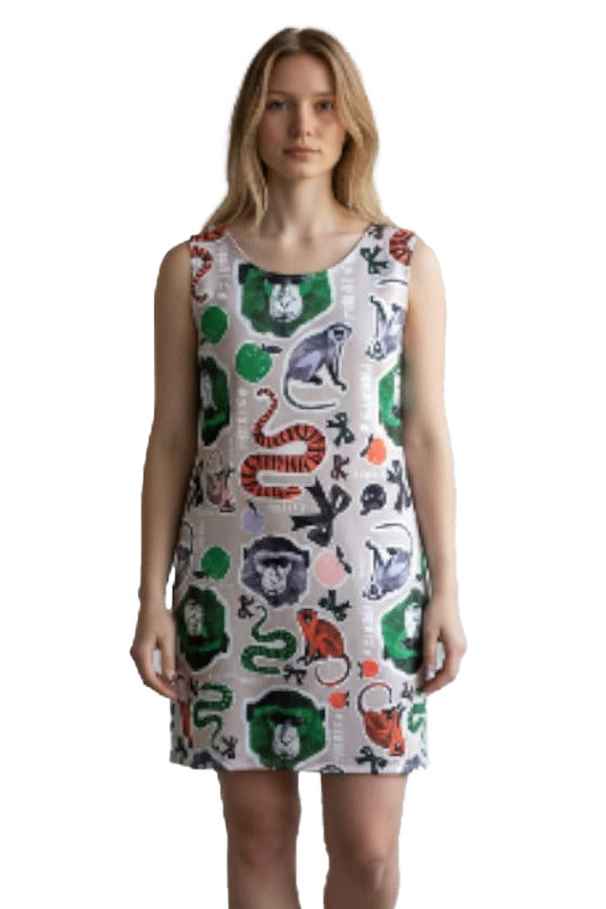 Este vestido corto sin mangas, inspirado en la colección Paraíso en su versión manzanas, el fruto de la tentación, destaca por su estampado multicolor lleno de energía. Su diseño tipo jumper ofrece un estilo versátil y cómodo, ideal tanto para eventos como para looks casuales donde quieras brillar con un toque de color.