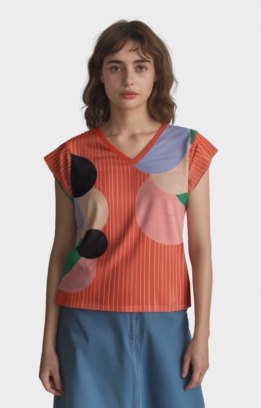 Esta polera de cuello en v y mangas cortas presenta un estampado de la colección Paraíso sobre fondo naranja. Disponible en tallas S, M y L.